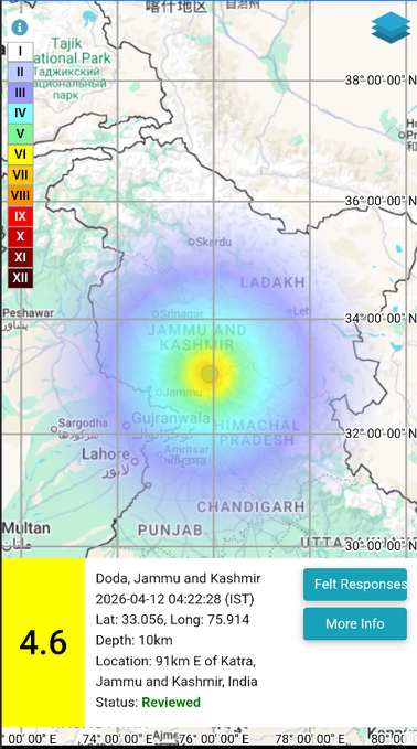 जम्मू-कश्मीर (न्यूज नेटवर्क) आज सुबह 04:32 तड़के जम्मू-कश्मीर के डोडा में रिक्टर पैमाने पर 4.6 तीव्रता का भूकंप आया। उस वक्त अफरा-तफरी मच गई जब धरती के तेज कंपन ने लोगों को नींद से जगा दिया। सुबह-सुबह आए इस भूकंप के झटकों ने पूरी डोडा घाटी को हिला कर रख दिया। लोग डर के मारे अपने घरों और इमारतों से निकलकर खुले मैदानों की ओर भागते नजर आए।